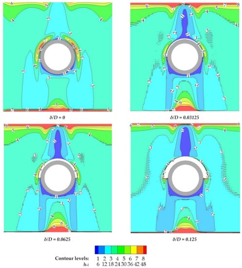 For δ/D = 0.03125 and δ/D = 0.0625, this alteration is not significant, yet for δ/D = 0.125 there is a dramatic change—low heat transfer coefficient region (contour 3 in Figure 16) doubles its size and merges with the smaller one at the upstream part of the tube. The combined effect of the enhancement on the leading edge with still strong horseshoe vortex intensification can explain the observed augmentation of mean HTC for the thinnest slit relatively to no-gap example (Figure 13). The mean of heat transfer enhancement with thin slits cut in the front of the tube (for low airflow velocities) should be further studied. It could be a promising method of heat transfer intensification in compact heat exchangers.