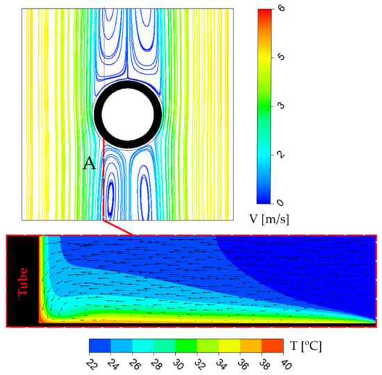 where Tin is periodic inlet air temperature, is presented for different gap sizes at the lowest Reynolds number (Re = 671) for front fin discontinuity location. Figure 16 was arranged to investigate the convective heat transfer enhancement relatively to no gap case. Intensification is present for the thinnest slit (δ/D = 0.03125)—for bigger gaps, this effect diminishes (Figure 10). The contours are similar for all cases shown; therefore, the analysis starts with a description of common map characteristics. There is a high hx zone at the inlet edge of the fin—this is the region where the thermal boundary layer is the thinnest. The area of this region is reduced at the center because of the presence of the fluid circulation flow spanning from the leading edge of the fin to the surface of the tube (Figure 17). This circulation is caused by the trace flow downstream of the upstream tube—being a result of boundary layer detachment. In Figure 17, one can see the circulation regions visualized by streamlines. The circulation area is wider in the rear region of the fin (behind the tube) than upstream of the tube (air flows from the bottom to the top in Figure 17). Because the circulating fluid moves with reduced velocity, local heat transfer coefficients are significantly lower. On the sides of the tube, air flows with increased velocity (Figure 17)—this corresponds to the high hx region in Figure 16 (contour level: 4, hx = 18–24 W/m2/K).