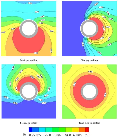 The enhancement of hx, by the presence of the slit, relative to ideal fin-tube contact example is not enough to cancel the negative effects of the fin discontinuity at its base (tube-fin junction)—in Figure 11 one can observe at least 6% lower heat transfer rate in the respect to δ/D = 0. In Figure 18, the most obvious consequence of the introduction of the gap can be seen—the blockage of heat flow in the fin area adjacent to the discontinuity. This effect is visualized by dimensionless temperature excess Θ contour map, where: