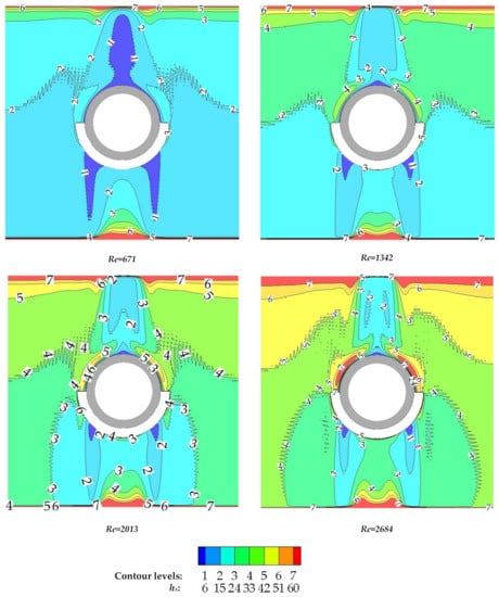 In Figure 16, the contour map of a local heat transfer coefficient, which is defined as: