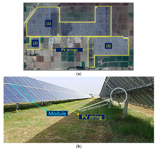 The PV power plant with an 18 MW installed capacity and single-axis tracking system is located at latitude 30.58150, longitude 72.89440, and 144 m in Harappa, Pakistan. Figure 1a shows an image of its location. According to the current power plant management, the plant’s location was selected considering the amount of annual solar irradiation, availability, and cost of the national grid’s land, and availability to transfer the energy produced.