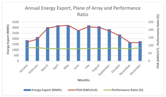 Table 6 summarizes all key figures and respective values measured every month during one year. On average, the PV power plant operation was characterized by a performance ratio of 81.4%, an average capacity of 19.6%, and availability of 99.96%, all this for a maintenance process that, on average, one had 4 PV modules to be cleaned by month. Table 6 indicates that July has the lowest value with 1.5 times. Meanwhile, cleaning is greater or equal to 4 times in all other months. Less cleaning in July is related to extensive local rains this month, making cleaning a less intensive task. Figure 2 plots the yearly evolution of the energy export, the array (POA) plane, and the PV plant’s performance ratio. Plotting these key figures indicates that the POA directly affects the energy export of the PV power plant.