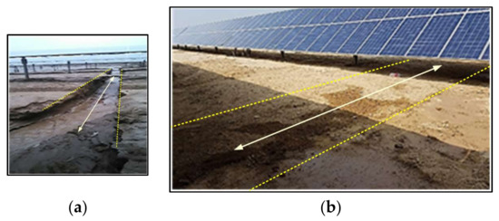 (a) Google image of the 18 MW PV power plant. (b) Rows of solar PV modules with 7 m distance to avoid near shading.