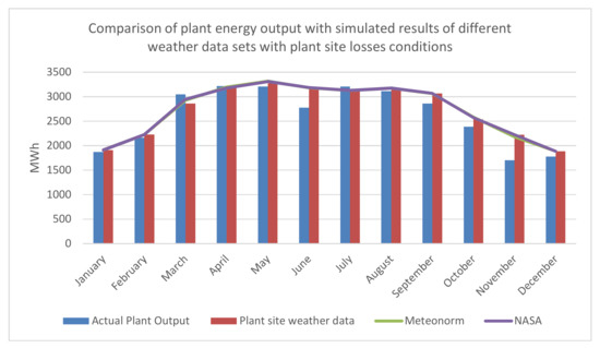 Software simulations have been performed with three different weather data sets and losses at the plant site. The reference performance value obtained based on Meteonorm weather data with average industry losses (present baseline for performance assessment) is significantly different from the value obtained using the site weather data and losses coefficients reflecting the power plant (recommended baseline for performance assessment). Power plant management needs to change their approach towards setting the baseline because comparing the annual energy output with the software simulated plant weather data with actual plant loss coefficients. It has been found out that the power plant is underperforming by 4.13% at the current state, which in monetary terms translates into a loss of 1.75 × 105 (EUR)/yr and can lead to a loss of 2.58 × 106 (EUR) throughout the lifetime of the project. Improving the operations and Maintenance of this loss can be translated into additional revenue.