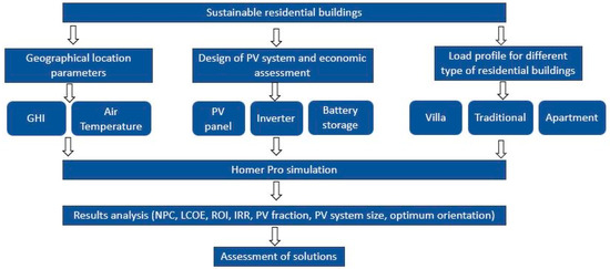 The proposed research method was determined based on latest developments in the technical/economic feasibility of rooftop PV solar systems with battery storage to identify the optimum size of the PV system (including battery) and optimal orientation of the PV panels. The focus was on three main categories: topographical location parameters, design of PV system, and load profile for different types of residential building as shown in Figure 1 actual data were input into the HOMER Pro software (3.13.8 Version).