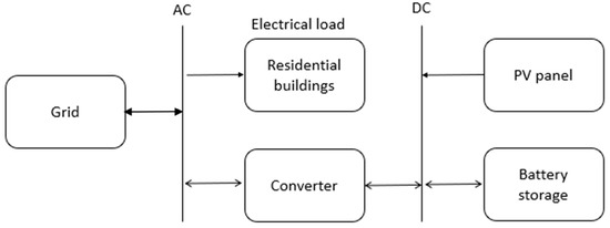 The configuration of the Integrated Energy System (IES) in the HOMER Pro software has two buses, an AC bus and a DC bus. The grid links to an AC bus and the PV panel and battery storage link to a DC bus. Between them (see Figure 2), there is an electrical load, a residential building, a villa, traditional house or apartment, connected to the grid and also connected to the PV and battery storage system through a converter.