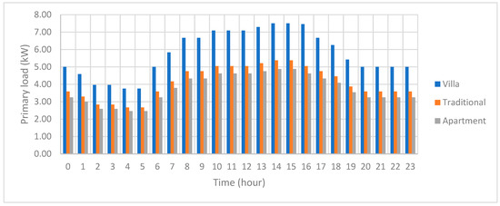 This research assesses the household load profile and total energy consumption by each of the three types of residential building, villa—on two floors, traditional—on one floor, and apartment, which is located in a building with two floors each containing four apartments. Rooftop areas by different types of houses are as shown in Table 1 according to the Housing Statistics Bulletin for 2019 [42].