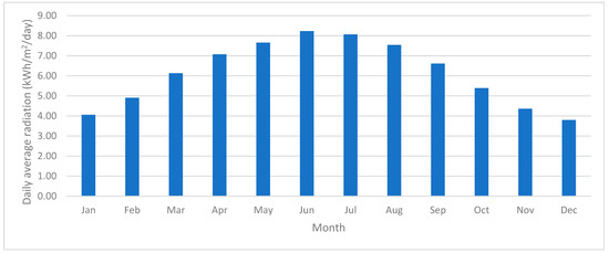 This study used data provided by NASA Surface Meteorology and Solar Energy [44], stating that the solar irradiation fluctuated between 3.93 and 8.17 kWh/m2/day, with a yearly mean solar irradiation of 6.14 kWh/m2/day, see Figure 4.