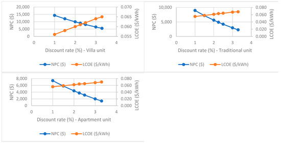 Shaahid [1] determined 0.215 $/kWh as the cost of producing energy (LCOE, $/kWh) from a hybrid PV-diesel system with battery storage in Yanbu City, KSA. Tsalikis and Martinopoulos [4] established that solar energy systems could satisfy over three quarters of the total energy requirements, and in other situations, close to 100%. Such figures suggest a discounted payback period of less than 6 years with a starting investment of € (10,000–12,250) [4].
