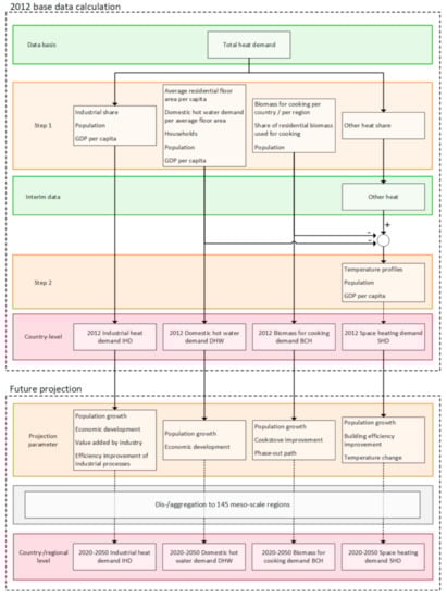 The base year for the heat demand data to be obtained is 2012. The method for the calculation of the heat demand for the four heat demand types consists of four steps, the first two steps can be seen in Figure 2: