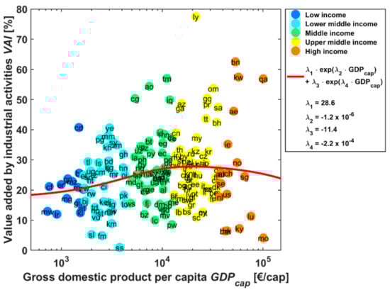 where λ1 and λ2 are form parameters. The limitation of 59.8% is the population-weighted average of the OECD regions. Furthermore, due to the few available data points, the fit does not perfectly match the value of 100% for a GDP per capita equal to 0 EUR/cap. For countries with a very low GDP per capita, values slightly above 100% are possible, which are limited to 100%.