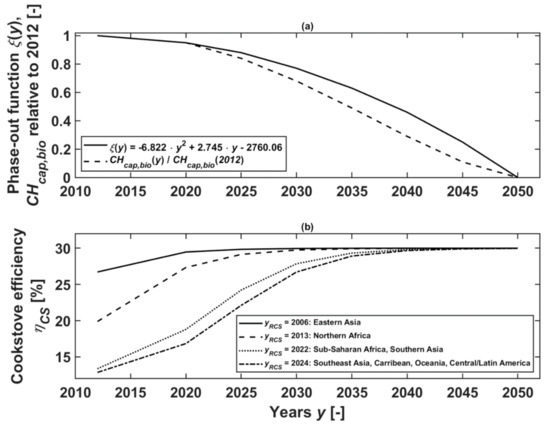 Conversion efficiencies for traditional biomass cookstoves are given in [72] with <15% for standard, traditional cookstoves (TCS) and 12–35% for improved cookstoves (ICS). Getting the right end-use energy demands the share of TCS and ICS, which is given for 2012 on a regional basis in [73]. An overview of the available data is given in Table 4.