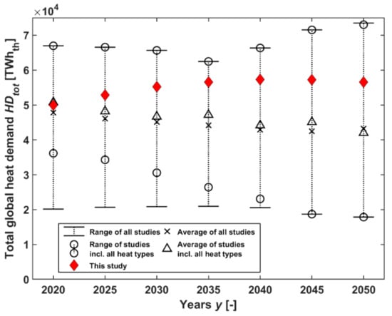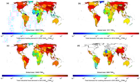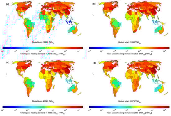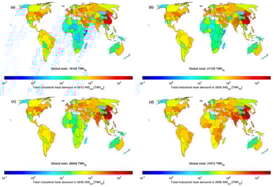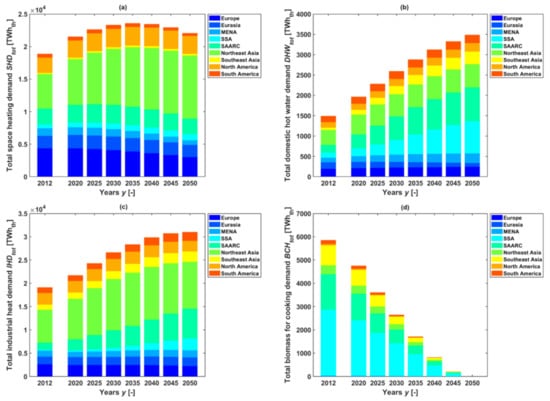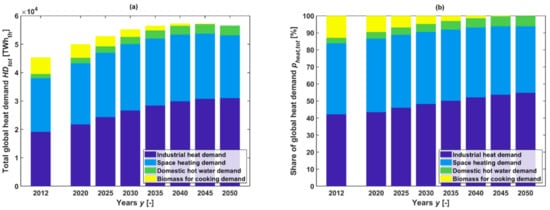 Furthermore, numbers for population statistics were taken from the United Nations [38]. For future projections of the countries’ population, the medium-fertility variant is used, which projects the world population to reach 9.74 billion by 2050. Input data, which are used for the respective heat demand type only, are presented in the subsections. All input data for major regions or countries can be found in Supplementary File S1.