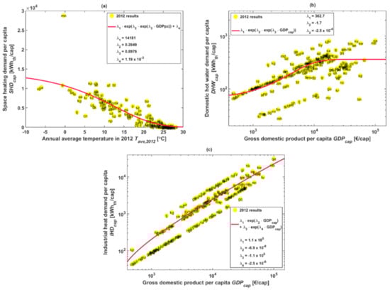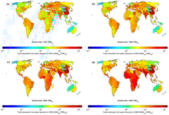 In the literature, a strong relation between hot water use and income level was found [41]. With increasing income, the standards of living increase as well as the overall use of water [42,43], and heated water. The average DHW per capita and country DHWcap,c is described, which can be multiplied with the population of the country popc to determine a country’s total domestic hot water demand DHWtot,c: