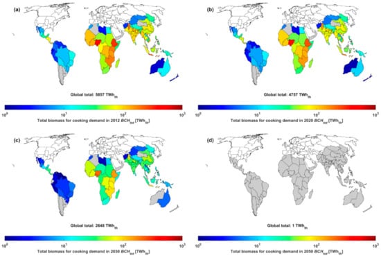In the case of South Asia and Southeast Asia, data of people relying on biomass for cooking in [18] are not comprehensive, e.g., a few countries are cumulated as “other developing Asia”. Furthermore, the total numbers in [20] do not match the regional resolution. Therefore, for countries without data in [20], numbers for residential biomass use from [53,54] are used. For India, domestic biomass numbers are available from [55].