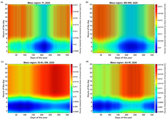 The calculation of the heat degree hours of every country takes place as described in Equation (19). Two databases are used in the above-mentioned resolution: The population and temperature, whereas the latter contains an 8760-h profile for every node. Temperature data are based on global weather data for the year 2005 from NASA [74,75].