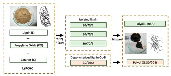 The formulations established for the isolated lignin oxypropylation comprised L/PO ratios (g/mL) of 20/80, 30/70, and 40/60, using three catalysts levels (1%, 3%, and 5%, lignin weight basis), e.g., the formulation 20/80/1 used a L/PO ratio of 20/80 with 1% catalyst. To produce the RPU foams, the polyols of the same series were mixed to give rise to the polyols designated by 20/80, 30/70, and 40/60 ratios (e.g., the polyol 20/80 was formed by the mixture of the 20/80/1, 20/80/3, and 20/80/5 polyols). For depolymerized lignins, only the formulation 30/70/2 was used. Figure 1 shows a schematic representation of the polyol synthesis considering as examples the 30/70 polyol produced from the isolated lignin (L 30/70) and the 30/70 polyol produced from the OL-B lignin (OL 30/70-B).