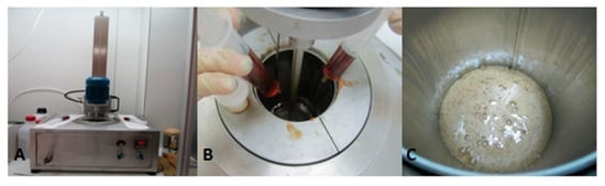 The RPU foams were synthesized using the one-shot free-rise method and an NCO/OH ratio of 1.1. All the produced lignin polyols were used at a content of 100% for the RPU foam synthesis. The required amount of polyol was firstly mixed with the following additives: 10% of glycerol, 2% of surfactant (SR-321 NIAX silicone), 2% of the catalyst system (DMCHA:NIAX-A1 (50:50)), 2% of water, and 20% of n-pentane (%, w/w, based on the polyol weight) in the synthesis reactor for 5 min to homogenize the mixture. Then, the diisocyanate was added and thoroughly mixed for 10 s. After that, the mechanical stirrer was stopped, and the foam was left to rise and cure. The foams nomenclature was established based on the used polyol name and their content, e.g., the sample 20/80/100 corresponds to the foam produced using 100% of the 20/80 lignin-based polyol. For comparison purposes, a reference RPU foam was also produced using the commercial chemical system. Figure 2 shows the used reactor and the various synthesis stages.