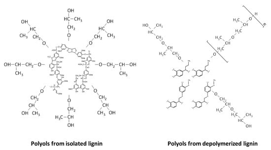 Schematic representation of the polyols’ molecular chains obtained from the isolated lignin and the depolymerized lignin.