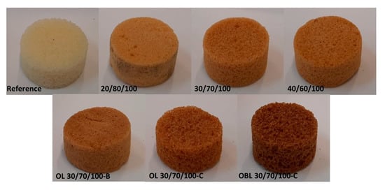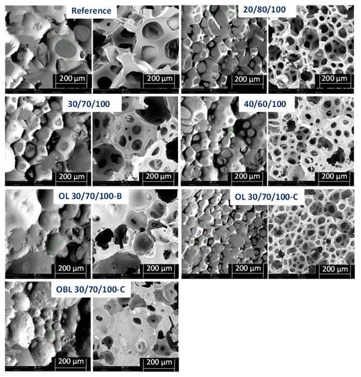 The obtained results of apparent density are presented in Table 2. The apparent density is closely related to the cellular structure of the foams []. The registered values for the lignin-based foams varied between 45 and 112.2 Kg/m3, while for the reference sample a density of 70.9 Kg/m3 was obtained. In general, increasing the lignin content in the foam formulation led to an increased foam density, namely to 44.7 and 54.0 Kg/m3 for the samples 20/80/100 and 30/70/100, respectively. The sample 40/60/100 had a density of 71.7 Kg/m3, closer to the reference foam. For the depolymerized lignin-based foams, the density values varied from 46.8 Kg/m3 (OL 30/70/100-C) to 112.2 Kg/m3 (OBL 30/70/100-C). This difference evidences the effect of the cellular structure once the OL 30/70/100-C foam had a homogenous cellular structure with a higher number of small-sized cells. In comparison, the OBL 30/10/100-C comprised larger cells and an irregular cell-size distribution.
