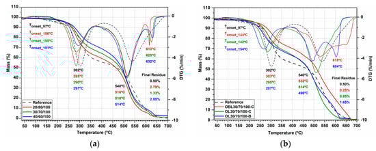 TGA and DTGA profiles obtained under oxidative atmosphere of: (a) reference foam and foams produced with polyols 20/80, 30/70, and 40/60; and (b) reference foam and foams produced with the depolymerized lignin polyols. (Tonset is the initial decomposition temperature).