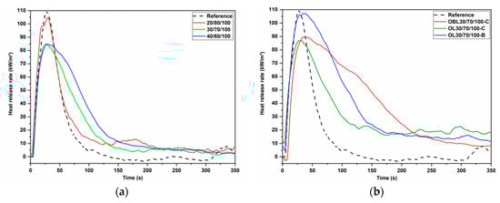 The elapsed time between the ignition and the pHHR (maximum of the HHR curves), shown in Figure 7a,b, can be related to the flame propagation rate, meaning that more sharp peaks are associated with faster combustion processes when conjugated with lower flame out times []. This behavior was observed both on the HHR curves of the reference and the 20/80/100 foams (Figure 7a). An entirely different pattern was noticed for the 30/70/100 and 40/60/100 HRR profiles. A similar time interval between the ignition and the pHHR was registered, with the flame out times being longer, varying from 106 to 122 s, thus reflecting a slower combustion process. For the depolymerized lignin-based foams (Figure 7b), the longer time interval between the ignition and pHHR was observed for the OBL 30/70/100-C sample. In addition, this foam presented the highest flameout time amongst all the produced samples. This fact can be partially attributed to the higher apparent density of this foam [].