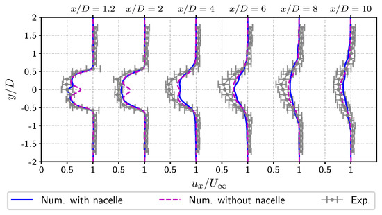 Comparison of the experimental velocity profiles with the numerical results obtained with and without nacelle, for = 1.5%, TSR = 3.67, m, and = 1.