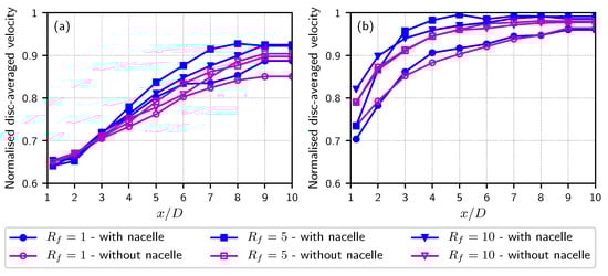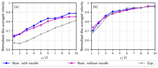 In order to evidence and compare more succinctly the shape of these turbine wakes, we consider the value of the average wake velocity integrated on the area of discs of the same diameter as that of the turbine, sampled at various distances in the turbine wake and normalised by the disc integrated value of the average upstream velocity . This procedure of wake integration is clearly presented in [55] for experimental results. Figure 6 shows that the differences on this quantity caused by the omission of the nacelle are minimal. Moreover, both numerical curves with are underestimating the experimental integrated velocity (see Figure 6a), which is a problem already identified and possibly due to a too high numerical dissipation, particularly visible at low ambient turbulence. However, for the highest ambient turbulence value of , the comparison of both numerical results with the experimental results depicted in Figure 6b are really encouraging us towards the simplest solution. Therefore, for the remainder of this paper, the turbine nacelle will not be taken into consideration as a matter of numerical simplification and speed-up.