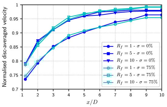 The influence of the turbulent structure size variation, represented by the value of , does not change the tendency as one can observe from the data presented in Figure 8 for = 15%. Choma Bex et al. [32,56] reported that a higher value of would improve the spectral representation of the turbulent kinetic energy cascade, a slope being nearly obtained from and above. However, as shown in Figure 8, still really overestimates the dissipation of the experimental disc-averaged velocity deficit for the higher values of . As a conclusion on that aspect, the value of does not have an influence on the velocity deficit and the driving parameter is the filling ratio , the experimental disc-averaged velocity deficit being accurately reproduced both for or with and always overdissipated with higher values of .