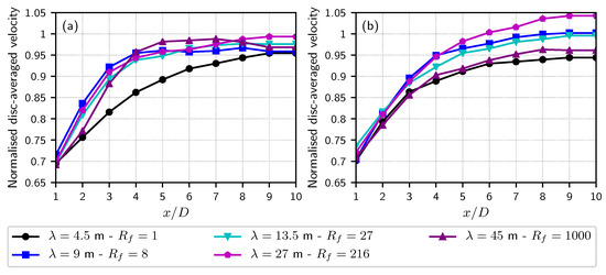 Comparison of the numerical disc-averaged velocities obtained for TSR = 4.1, = 10% and several . (a) . (b) .