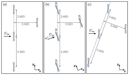 Four tidal turbine array configurations: (a) initial configuration (straight flow), (b) configuration with a yawed flow, (c) configuration with a yawed flow used for the simulation.