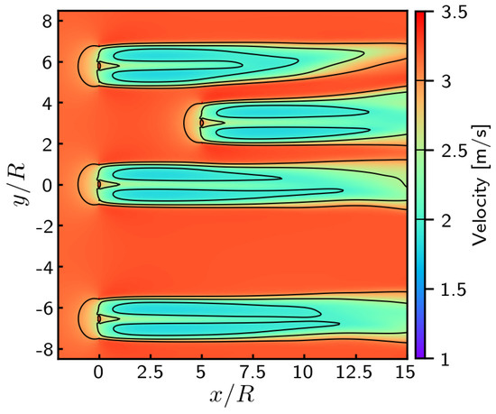 For the sake of comparison, Figure 11 shows the flow around the four turbines in the configuration of Figure 10a without ambient turbulence. For this computation, wake induced turbulence and dissipation were accounted for using only the LES model based on the PSE method implemented in the code [9]. The SEM contribution was switched off imposing an absolute constant incoming velocity m/s. From Figure 11, it can be seen that there is hardly any interaction between the turbines except for a slight wake deflection of the two upstream upper turbines. Besides, the wake extension is very long and exceeds the length presented in this figure. This proves the conservative property of the code even on long distances.