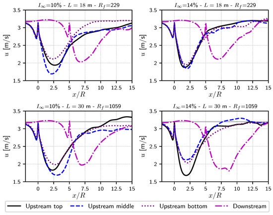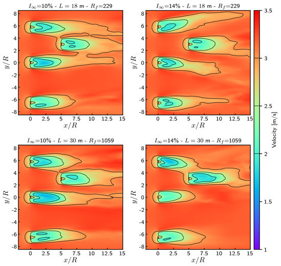 Time-averaged wake lines obtained for two turbulence intensities and two integral length scales (TSR = 4.1, ). For each turbine, the corresponding line passes through its centre. The solid grey line depicts the incoming velocity m/s.