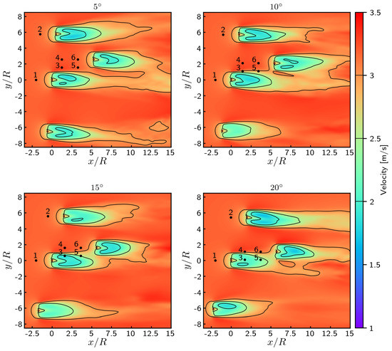 Figure 14 shows the wake configurations for an incoming flow inclined with angles ranging from to with respect to the main current direction. The positions of the turbines correspond to the configuration shown in Figure 10c. For these computations, the same numerical parameters were chosen as for the case with and m, imposing with . All the turbines are rotating at TSR = .