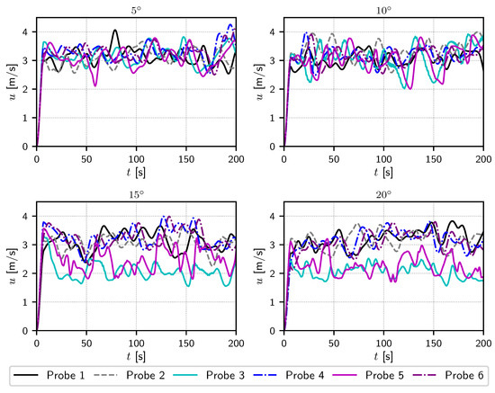 Velocity u measured by six numerical probes, for four yaw angles (, m, , TSR = 4.1, ).