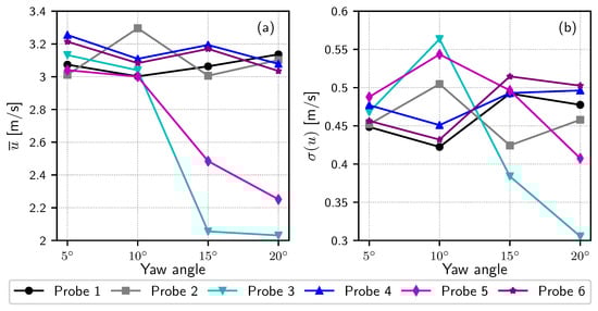 For a yaw angle, some interesting phenomena can be identified. Firstly, probe 2 shows a higher mean velocity value together with a higher standard deviation. There is no other explanation than the possibility of “natural” oscillations due to the passing of turbulent structures which cause the velocity to increase and were not counterbalanced by a sufficient averaging duration. Probes 3 and 5 show close to the same mean velocity values (Figure 17a) but highly impacted standard deviations (Figure 17b). For these two probes, clear explanations can be given: the mean velocities are not highly impacted because they are at the outer limit of the wake, as shown in Figure 14 but a higher standard deviation is observed because these probes are in the mixing layer of the wake. As a conclusion for the downstream turbine, the mean flow velocity profile will not be highly modified (no real shear in the velocity profile) but the turbine will perceive much higher velocity fluctuations at the tip, possibly leading to advanced ageing and possible damage of the blades and drivetrain.