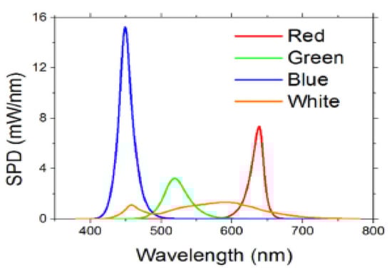 Remote-controllable light source grouping, together with a quadruple-chip light-emitting diode driven by pulse width modulation currents to provide healthy lighting: RGB tricolor LEDs can emit pure white light. The color rendering index is of worse quality when the CCT is changed. The combination of white LED with the red–green–blue–white (RGBW). The authors of this research believe that the best solution for good interior lighting are RGBW LED (Figure 2) [70].