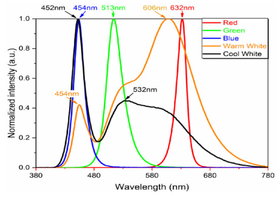 Intensity and spectral distribution of different combinations of LED visible light emitters [72].
