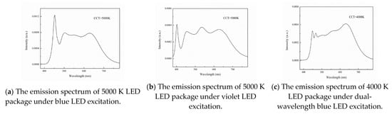 Another approach involves spectral energy distribution with qualities close to daylight with a high CRI, with a continuous and balanced spectrum in the visible emission range, ideally harmonized with human sensitivity. The high blue energy part of the total blue range can be reduced to minimize the ups and downs of the spectral energy distribution. The spectral intensities in the visible range of three developed LED combinations are shown below (Figure 4) [72].