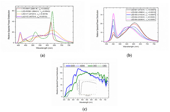 LED illuminants spectral power distribution of (a) the SPD, (b) the Standards D65 and (c) D50 [79].