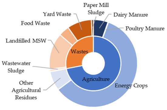 Agricultural waste is produced when crops are grown for non-energy purposes. Common crop residues in New York State include corn stover, wheat straw, barley straw, oat straw, sorghum stubble, sunflower residue, and soybean straw (i.e., note that the anaerobic digestion of soybean straw and sunflower residues has not been studied) [65]. Crop straws and residues from the wood industry represent valuable biomass for the solid biofuel industry and subsequent production of syngas [66]. However, this downstream processing is not the focus of this review. Based on crop production data from the United States Department of Agriculture (USDA), the amount of crop residues that might be used for energy purposes was determined (see Appendix A). These data were then used to estimate the annual potential for biogas production for agricultural residues (Table 2), which is about 4 × 108 m3.