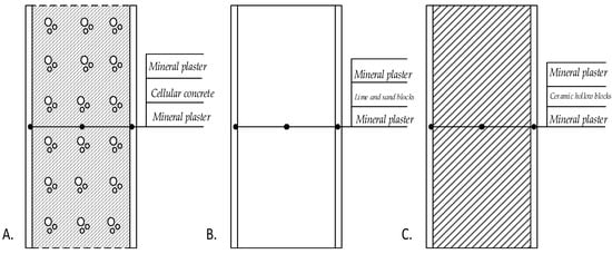 Cross-sections of the analyzed partitions made of: (A) cellular concrete; (B) lime and sand blocks; (C) ceramic hollow blocks.