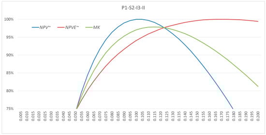 The metacriterion MK was determined according to Formula (12), with the weights assumed w1 = w2 = ½ (it was assumed that both criteria have the same weight). Both NPV~ (d), as well as NPVE~ (d), take values ≤ 1, with NPV~ (d) = 1 (100%) for d = dopt, a NPVE~ (d) = 1 (100%) for d = dEopt. The metacriterion MK takes the maximum value for the thickness d = dMKopt between dopt and dEopt. Because the graph of NPVE~ (d) is flatter around the maximum than the graph of NPV~ (d), the optimum thickness of dMKopt is however much closer to the dopt than dEopt. The situation is similar for all other variants.