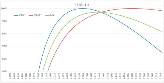 NPV~, NPVE~ and MK values depending on the thickness d for Variant P2-S3-I1-II.