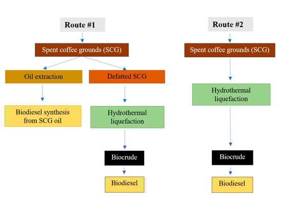 Coffee is one of the most popular beverages worldwide. Approximately 9.9 billion kilograms of coffee were consumed globally in 2019 according to the International Coffee Organization [1]. Enormous amounts of spent coffee grounds (SCG) are generated after coffee brewing, and most of them are underutilized and disposed of in landfills as opposed to being used as compost, mainly because SCG are high in several compounds that are detrimental to the environment [2]. Although the direct combustion of dried SCG generates a higher heating value than wood pellets at the same moisture content, the emission of nitrogen oxides in the flue gas needs to be largely reduced [3]. Recently, the incorporation of biorefinery concepts into SCG valorization has gained much research attention [2,4]; in particular, extracting oil from SCG for biodiesel production has been well investigated. Rocha et al. reported that about 12 wt.% SCG oil was obtained from ultrasound-assisted extraction of SCG (using hexane as the organic solvent), along with an oil-to-biodiesel conversion efficiency of 97% [5]. Caetano et al. used a pilot-scale Soxhlet system to extract oil from SCG, and ~6 wt.% SCG oil was recovered; the conversion efficiency of SCG oil into biodiesel ranged from 47.4% to 86.0%, depending on the applied extraction solvents and biodiesel synthesis procedures [6]. Liu et al. attempted to directly trans-esterify oil in SCG into biodiesel, and a conversion efficiency of 98.6% was reported [7].