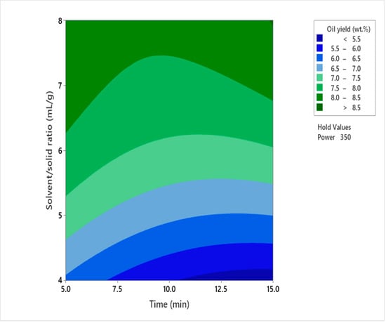 As illustrated in Table 3, the effect of solvent/solid ratio was also dependent on the extraction time (ratio*time p-value = 0.049 < 0.05). The ratio*time interaction was demonstrated by a contour plot as shown in Figure 2. Using a solvent/solid ratio of ~6.3 mL/g at an extraction time of 5 min was able to achieve ~8 wt.% SCG oil yield, whereas a solvent/solid ratio of 7.5 mL/g was required to obtain a comparable SCG oil yield for an extraction time of 10 min.