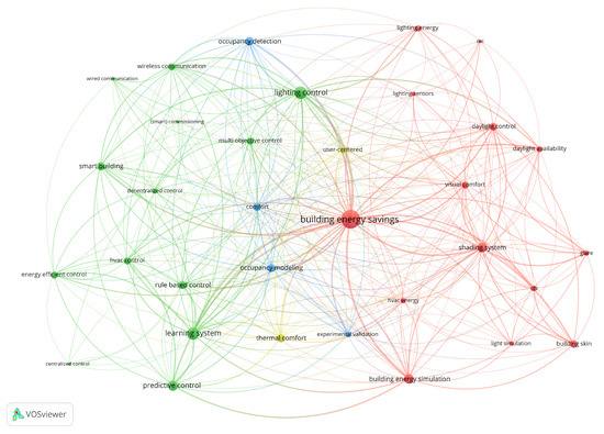In the VOSviewer based analysis, an increasing correlation was found between the items ‘occupancy detection’ and ‘lighting control’ (see also Table 9). Improving occupancy detection for control systems is shown to be beneficial for energy efficiency because artificial lighting can be reduced in areas where it is not needed [54]. In this context, Athienitis and Tzempelikos as well as Ryckaert et al. point out that a reduction in artificial lighting use is also associated with a reduction in cooling demand [55,56]. The authors state that, in the case of daylight control, beneficial energy effects can be expected by including detailed occupancy detection. Furthermore, considering a winter situation, heating energy demand can be reduced by opening the shading system on large parts of the facade, while only single shading elements are closed to protect each occupant from glare individually, depending on the sitting position in the room and the incident sun angle. In addition, in the summer situation, opening only single shading elements to facilitate sufficient daylight for individually occupied workplaces, while closing the rest of the facade, can significantly help to avoid overheating. Literature studies on this topic proved to be underrepresented in the literature reviewed, so this should be the subject of research in future work.
