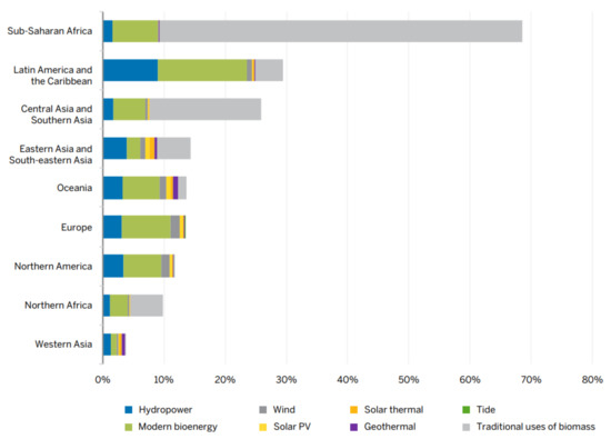 Sustainable development has been the mantra of the modern world, and accordingly, the United Nations had adopted 17 sustainable development goals (SDGs) [1] with emphasis on gender and social inclusion to eradicate poverty, protect the globe and promote peace and prosperity. It is understood that processes involved in energy generation are one of the key contributors to climate change, and the energy sector generates nearly 60% of greenhouse emissions. One of the SDGs, i.e., SDG-7, is focused on providing affordable and clean energy to the civic society by fostering innovations and investments at different stages of energy production and generation. There was a 6.2% [2] increase in the percentage of the population with access to electricity across the world from 2010 levels, and this value is 13.2% in the case of the rural community. As per the International Renewable Energy Agency’s (IREA) 2020 energy progress report [3], 0.8 billion people were still without access to electricity in 2018. Grid-based energy systems have been subjected to economic and governance barriers for decades. Therefore, there is a push towards decentralized [4] or distributed and smart systems due to their ability to transform energy access by covering all the three elements of energy trilemma, i.e., costs, emissions and security. However, the increased penetration of distributed energy sources may cause unusual effects on the electricity distribution network, including reverse power flow, leading to the need for changes in the conventional power system structure, and this is where smart electricity systems will be crucial to manage the entire network. There are almost 400 individual technology designs and components currently at different technology readiness levels (TRL) [5] to reduce CO2 emissions. Solar technology is among them with the scope of both on grid and off grid connections to produce electricity and heat. Photovoltaics (PV) and solar thermal are well-established technologies to produce solar energy [6]. However, it can be inferred from Figure 1 that the share of solar PV and solar thermal in different regions is relatively low compared to other renewable energy sources like biomass, hydropower and modern bioenergy.