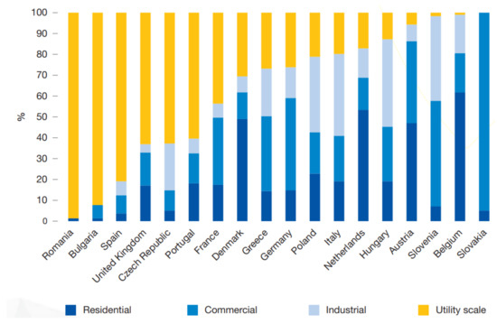 Share of different segments in Solar PV total capacity of EU selected countries until 2018 [22].