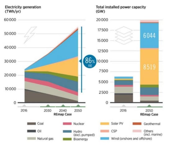 The main drivers of the global energy transformation from fossil fuels are a fall in renewable energy costs, reduced carbon emissions, enhanced energy security, complete energy access, job creation and economic gain. According to the energy transition report [5], the share of renewable energy in the primary energy supply has to be 65% by 2050 from 15% in 2015. This enormous increase would need investments amounting to USD 29 trillion through to 2050. In the recent IREA report [7], the share of renewable energy in electric power generation by 2050 was reported to be 86%, while annual solar PV deployment was set to 360 GW/yr. China, the United States and the European Union are the top three residential PV growth markets [8]. Solar PV power would be supplying 13% and 25% of total electricity demand by 2030 and 2050, respectively; that is, a final tenfold increase in share compared to 2016 levels to meet the Paris climate change agreement [4]. Out of this 25% projection, 40% would be coming from distributed solar energy and the rest from the utility-scale installations.
